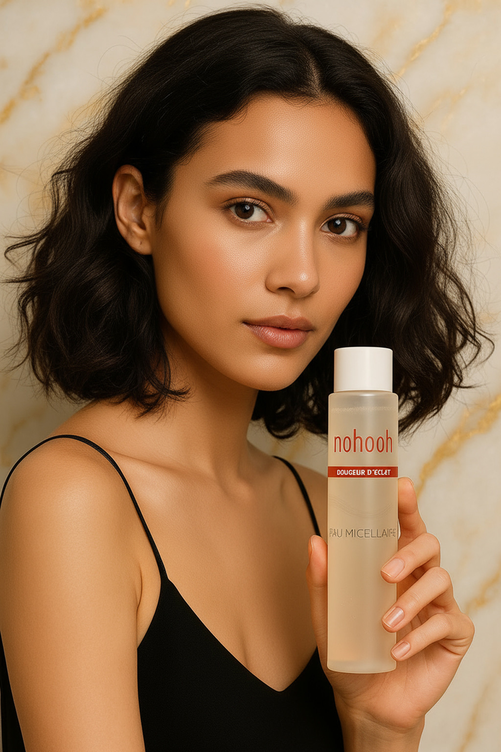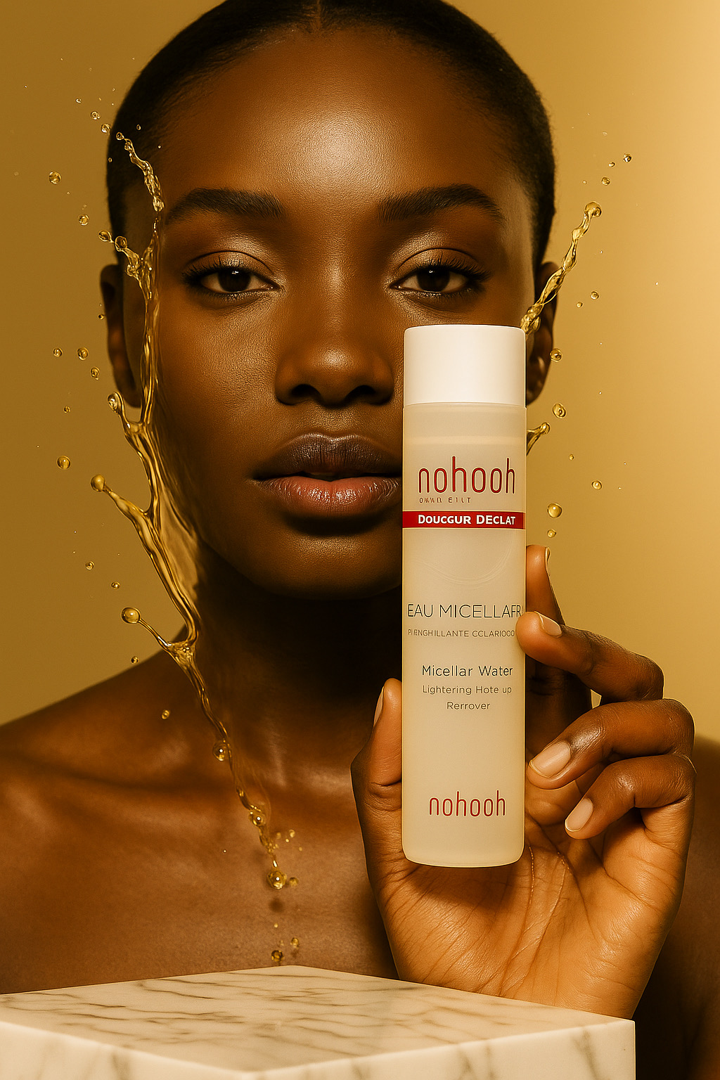 L’Eau Micellaire Démaquillante Eclaircissant NOHOOH bénéficie d’une formule respectueuse de la peau pour une triple efficacité démaquillante, adoucissante et éclaircissante. Texture douce, non grasse, sans rinçage.